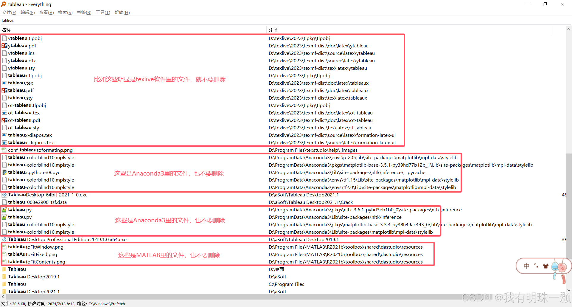4、有 Everything 软件的朋友,可以打开该软件,搜索:tableau,把查找到的明显是 tableau 软件遗留文件删除,千万不要全删哦。