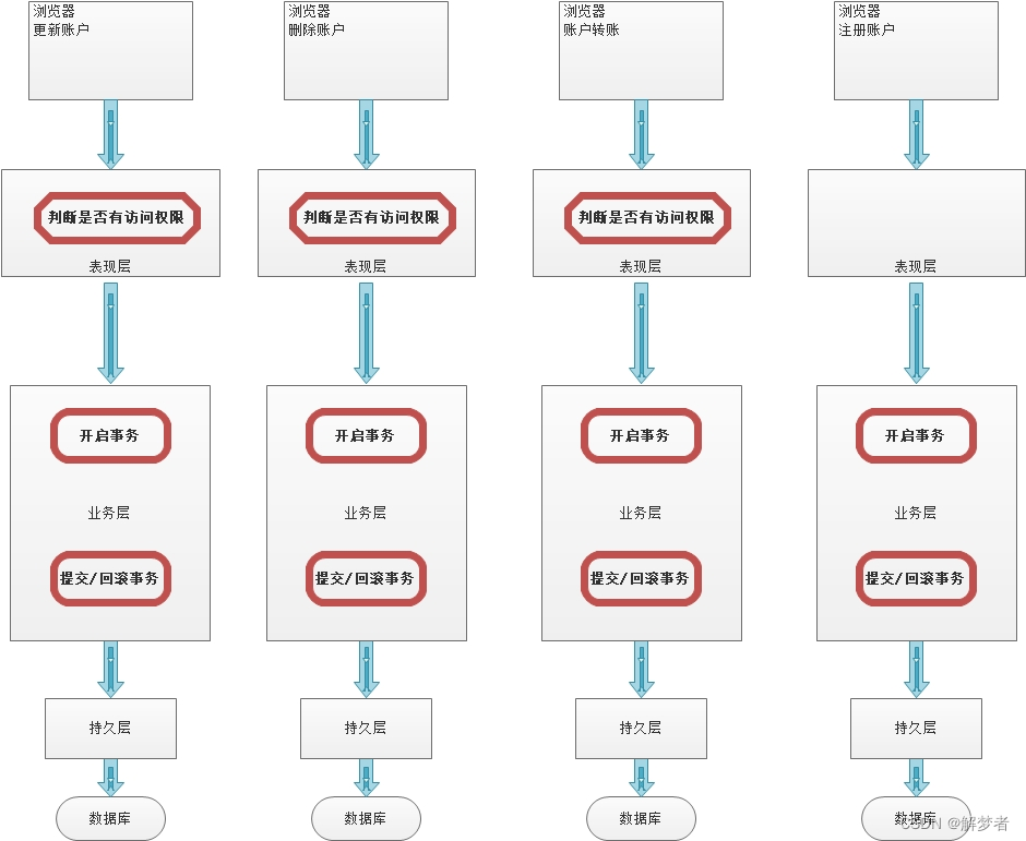 如果aMethod()回滚的话,bMethod()和bMethod2()都要回滚,而bMethod()回滚的话,并不会造成aMethod()和bMethod2()回滚。