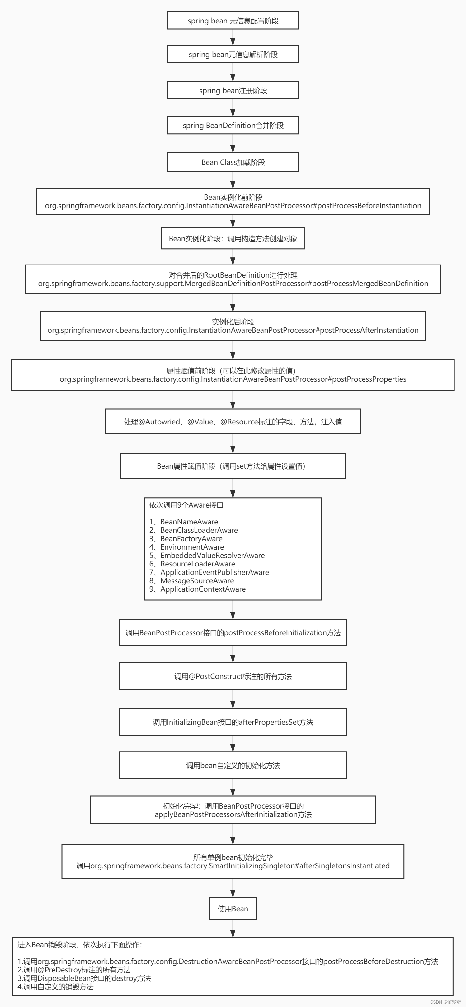 - 10、最后,如果这个Bean的Spring配置中配置了destroy-method属性,会自动调用其配置的销毁方法【destroy-method】,或代码中的