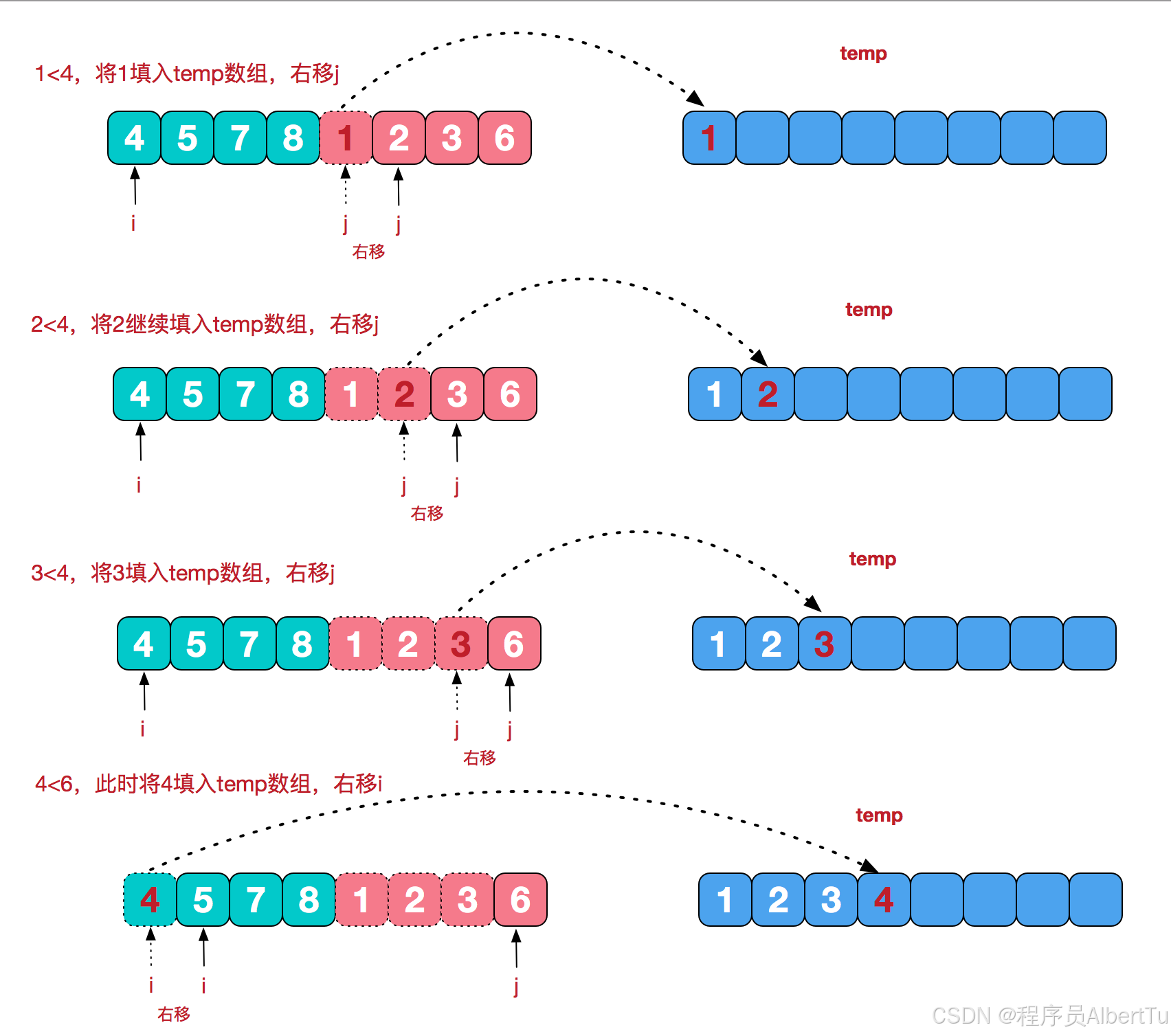 归并排序(附C++实现及验证) 归并排序的核心思想是将一个大数组分割成两个小数组去解决。然后,这两个小数组排序后再将它们合并起来。这个过程中的基本操作是比较两个数组的最前面的数,将较小的数先取出,放到输出数组中。通过递归的方式不断将数组分解,直到每个小数组只有一个元素,认为每个小数组都已经有序,再将它们合并成一个有序的数组。