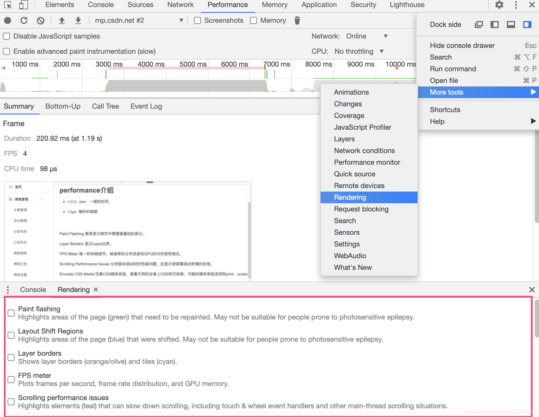 2、点击DevTools右上角的菜单,在More tools里面选中Rendering,这里面包含了如下其他各种工具的设置项