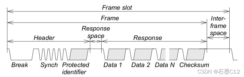Header场中包含break,synch以及受保护的id。其实break就是告诉总线传输开始,然后用synch同步始终,然后使用受保护id来寻址,如果有LIN slave节点可以提供这个id的服务,那在master发出protected id后,就他就会插入一个应答,与IIC从机在sda上给出类似应答类似。值得注意的是,这个protected id并不是slave从机地址,而是想要订阅的报文id,换个说法,一个slave从机可以提供多个报文id的服务,比如一个车灯控制ECU,可以提供灯控制、状态、故障码、软硬件版本信息等多个LIN ID服务。而slave从机地址是隐性的与其所提供的报文ID是有个对应关系的。