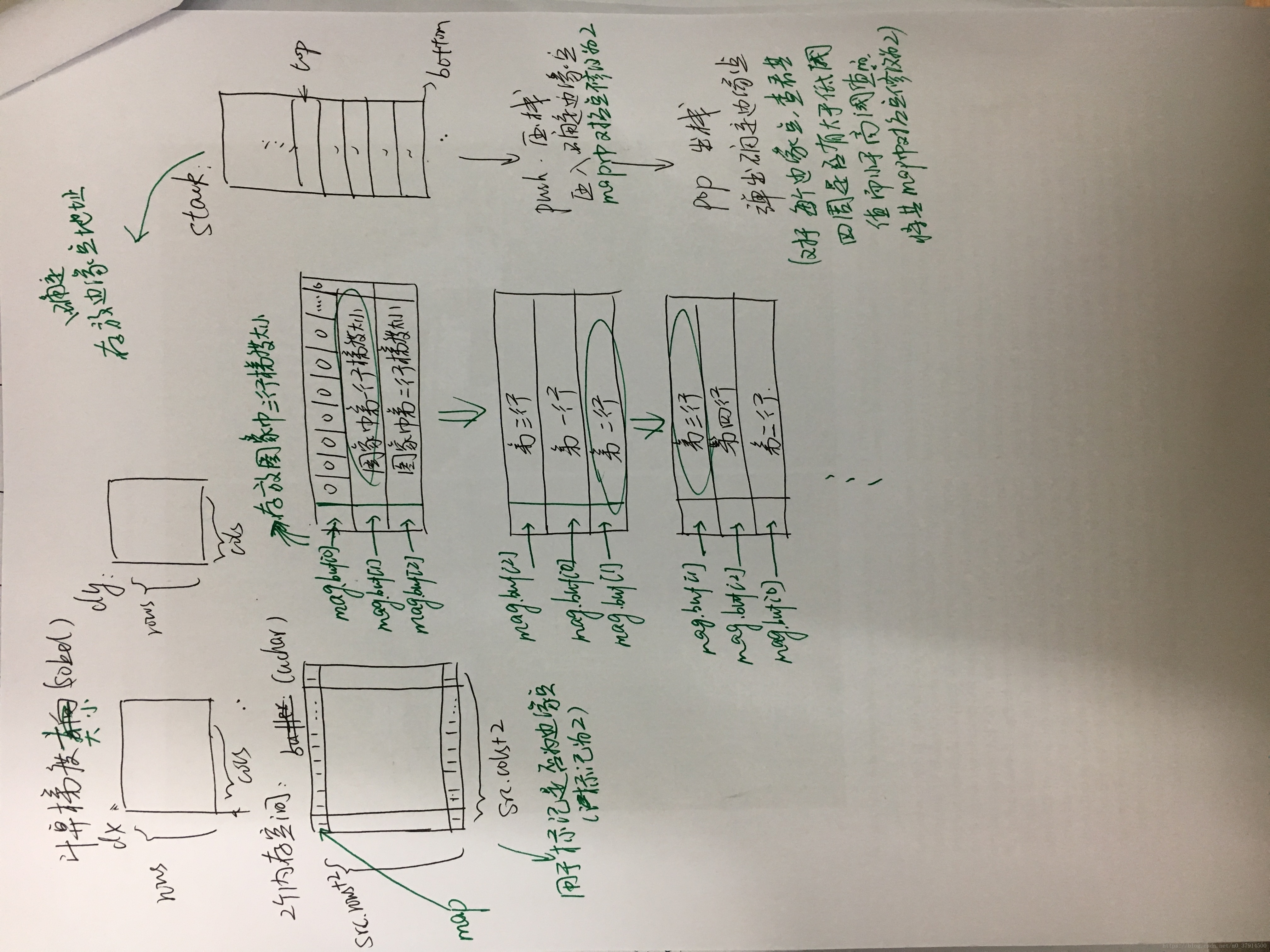 本博客是有关opencv中canny源码解析,下图是根据代码画的示意图(图片自动转向了,不知如何调整,菜鸟一枚没办法,如有解决方法,望告知