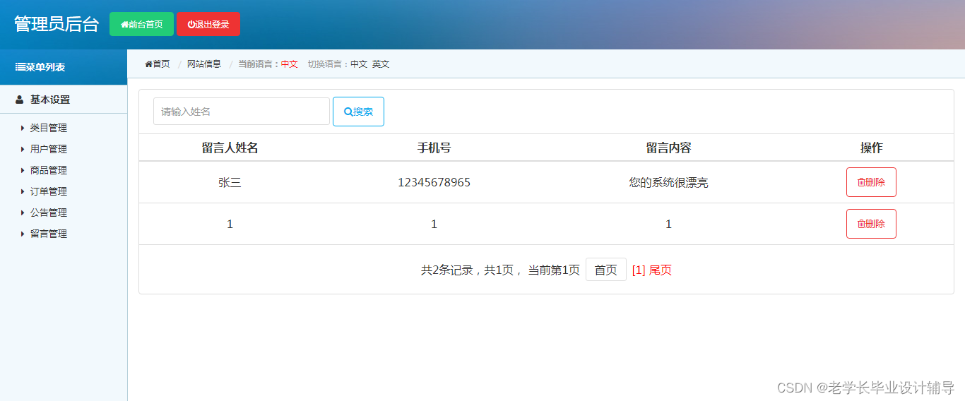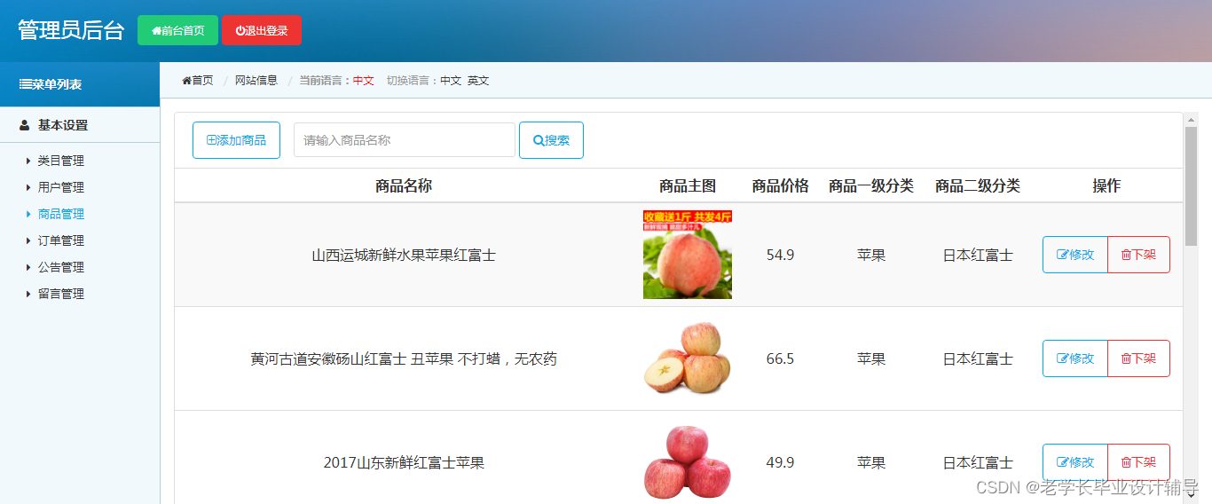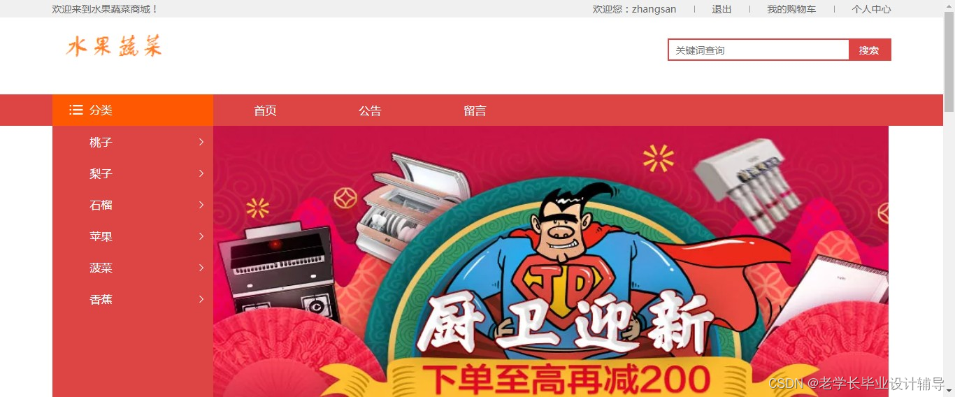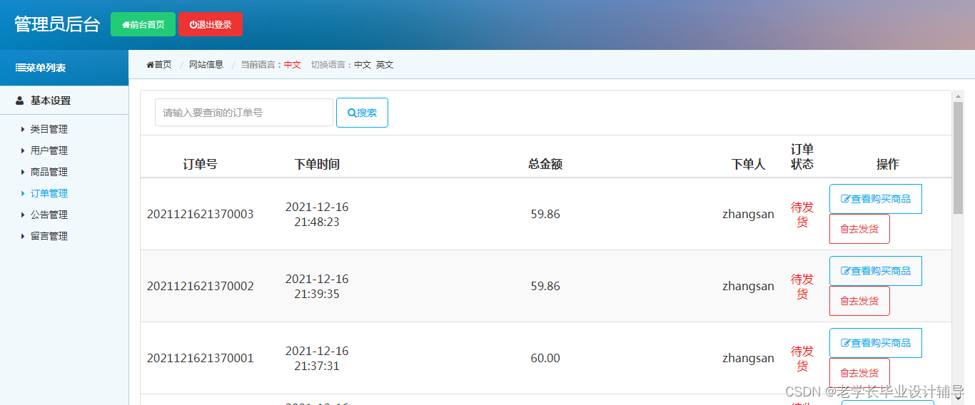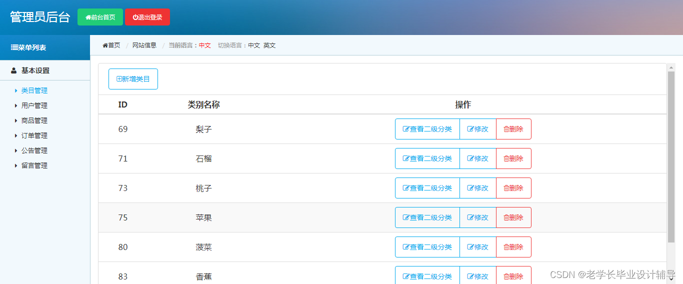 管理员用户:类目管理,用户管理,商品管理,订单管理,公告管理,留言管理等功能。