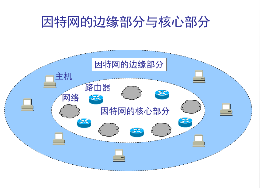 - 边缘部分 :由所有连接在因特网上的主机组成。这部分是用户直接使用的,用来进行通信(传送数据、音频或视频)和资源共享。