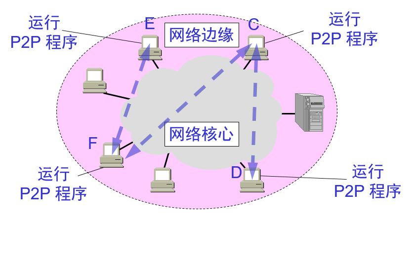 - 只要两个主机都运行了对等连接软件(P2P 软件),它们就可以进行平等的、对等连接通信。