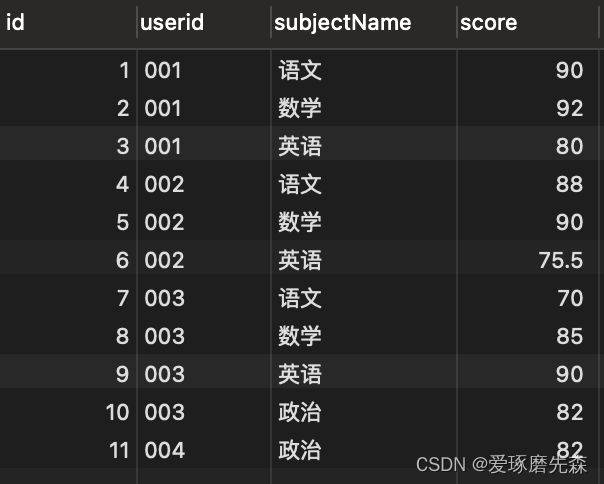 SUM(IF(subjectName = '语文', score, 0 )) AS '语文',