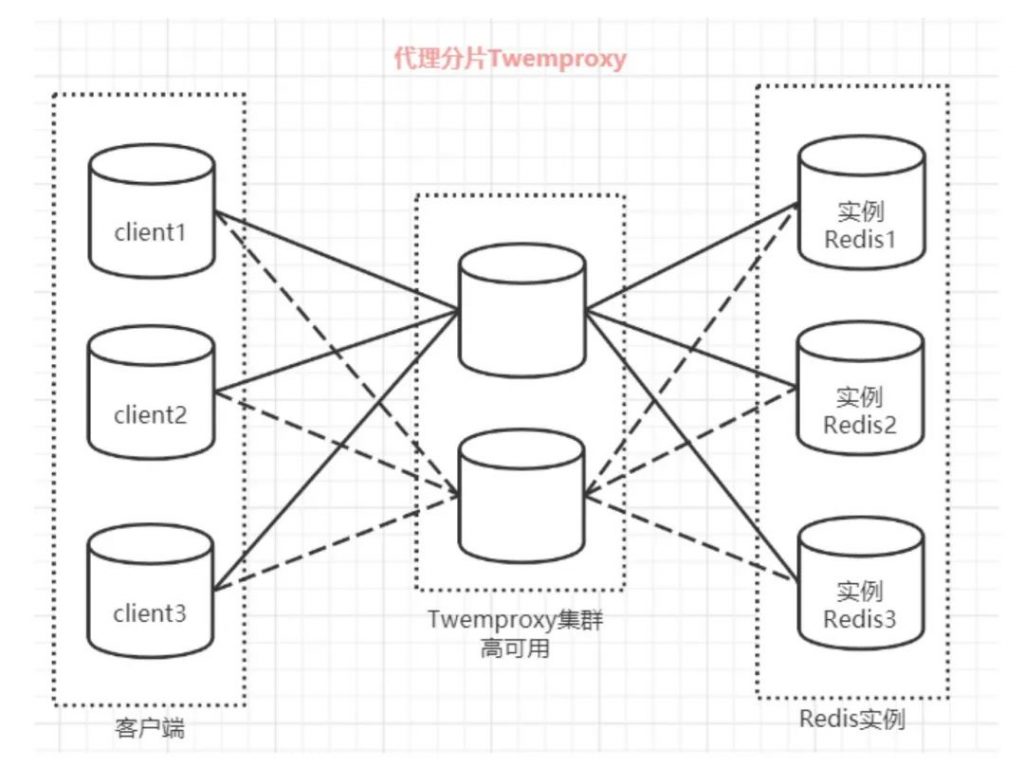 redis代理分片用得最多的就是Twemproxy,由Twitter开源的Redis代理,其基本原理是:通过中间件的形式,Redis客户端把请求发送到Twemproxy,Twemproxy根据路由规则发送到正确的Redis实例,最后Twemproxy把结果汇集返回给客户端。
