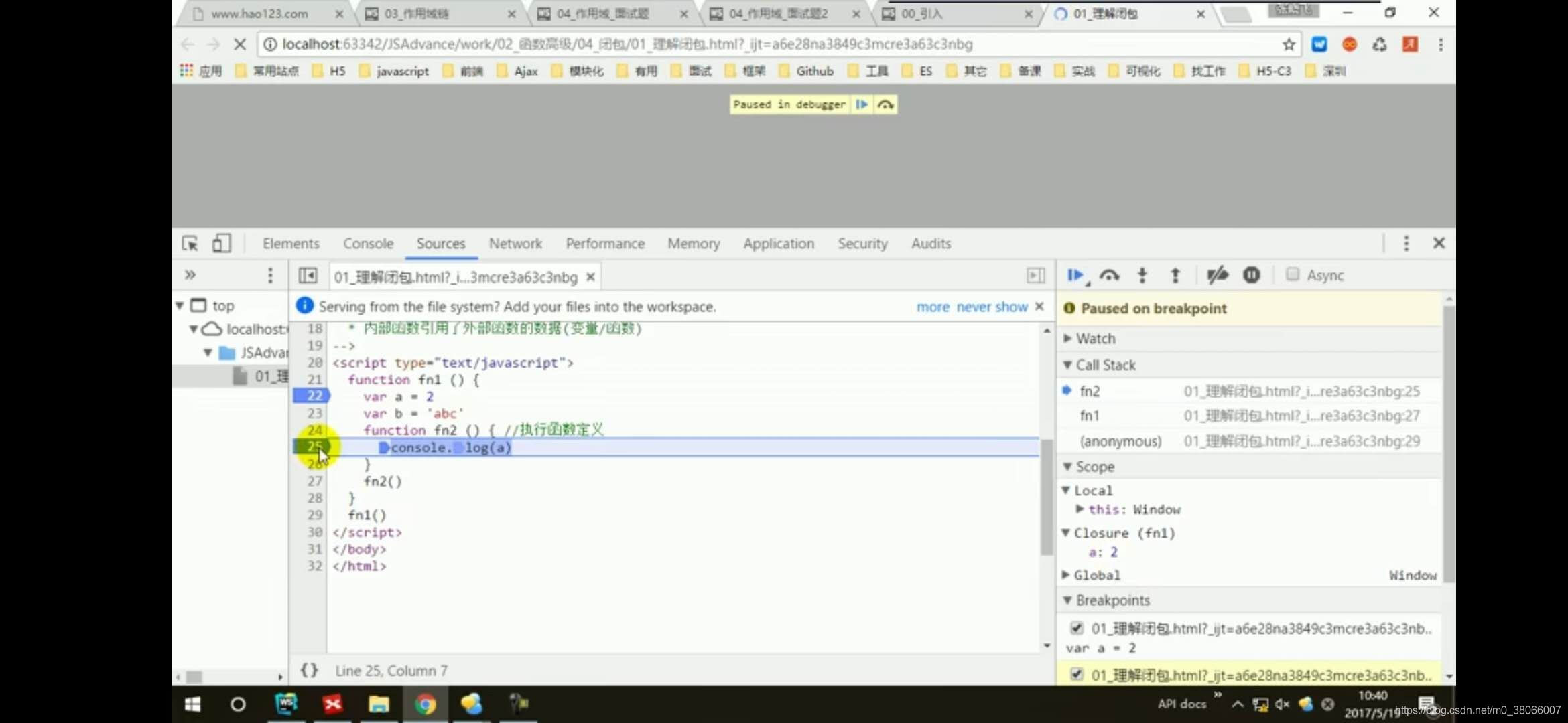 function fn1() { var a = 2; function fn2() { a++; console.log(a); } return fn2; } var f = fn1(); f(); f();