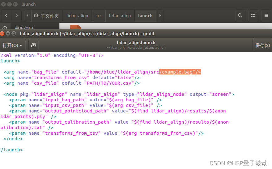 修改lidar_align.launch文件,将自己的rosbag数据包路径填写到第四行位置: