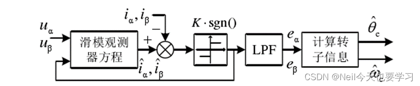 在永磁同步电机滑模观测器控制中,转子的位置和转速信息与反动电势密切相关。滑模观测器控制基本设计思路是:利用永磁同步电机的电压、电流信息,通过永磁同步电机数学模型,估算出电机在两相静止坐标系中的反电动势信息,估算出转子位置与转速,分别将其反馈给矢量控制的电流环和转速环,实现永磁同步电机无速度传感器控制;滑模观测器模型如图所示。