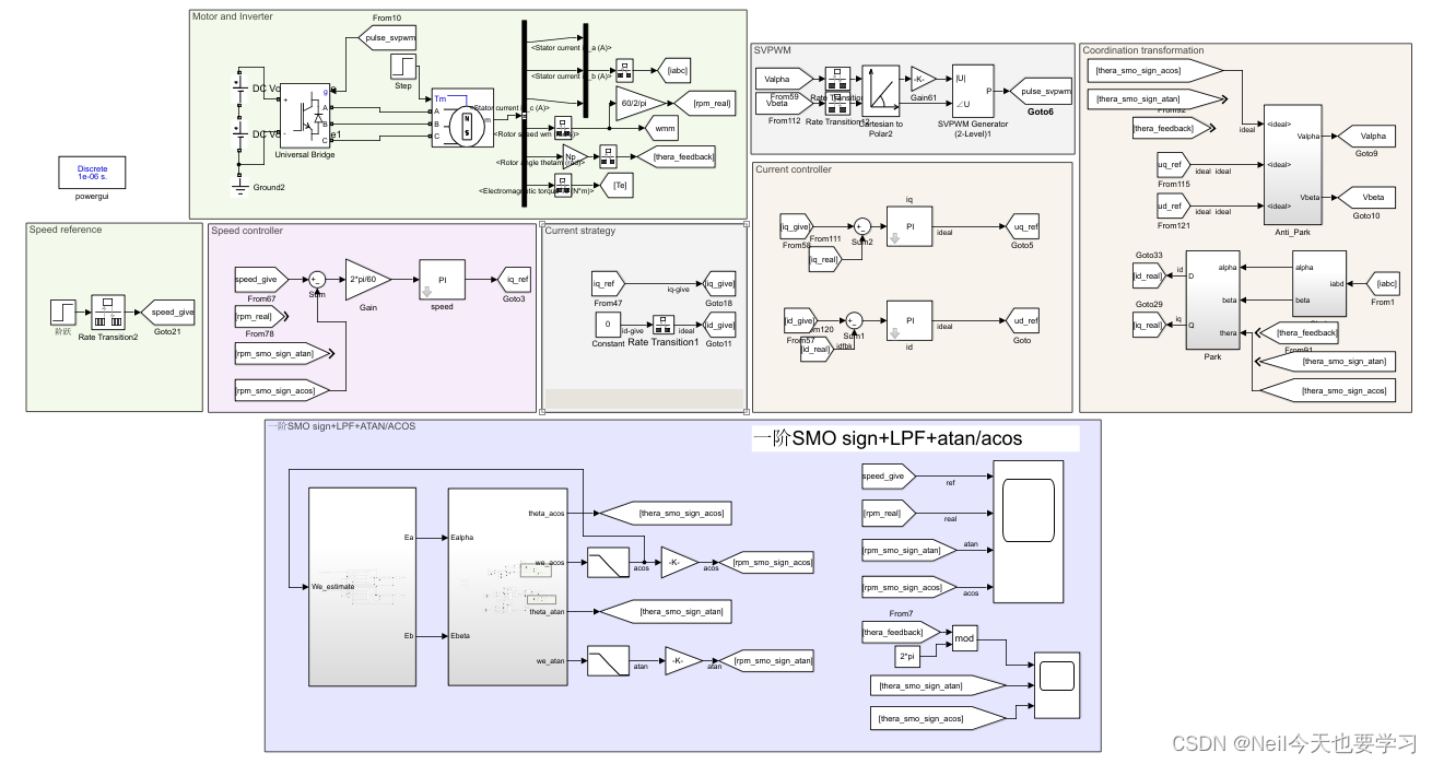 在MATLAB/simulink里面验证所提算法,搭建采用反三角函数的传统SMO仿真。采用和实验中一致的控制周期1e-4,电机部分计算周期为5e-7。仿真模型如下所示: