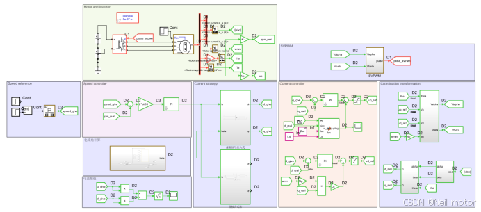 在MATLAB/simulink里面验证所提算法,搭建虚拟直流信号注入式MTPA仿真。采用和实验中一致的控制周期1e-4,电机部分计算周期为1e-6。仿真模型如下所示: