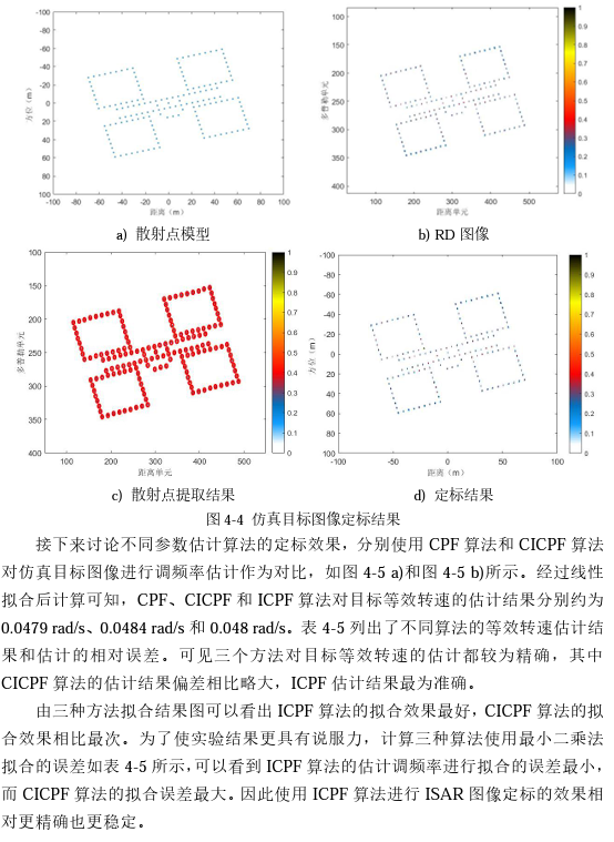 本章内容简介:分析了CPF(三次相位函数法),CICPF(相干三次相位函数法)和ICPF(积分三次相位函数法)三种LFM信号调频率估计方法,分析了基于LOG算子(高斯拉普拉斯)的散射点提取方法,进行仿真实验成功实现了高精度的方位维定标(也称横向定标。