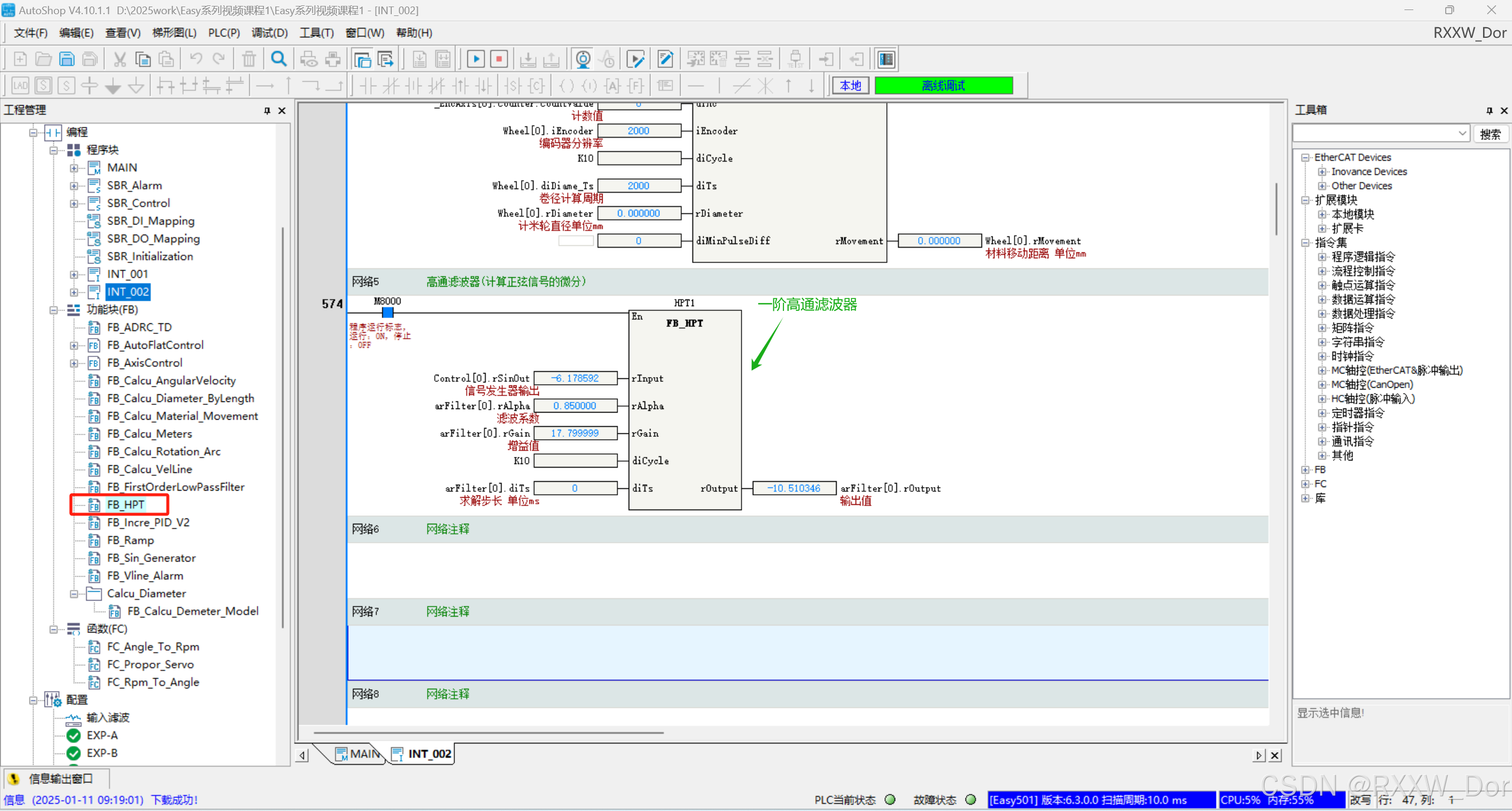 Easy系列PLC一阶高通滤波器(完整ST源代码)