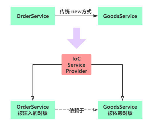- 为何是反转: 传统 new 方式,我们都是自己在对象中主动创建被依赖的对象,这是正转;有了 IOC 后,所依赖的对象由 IOC 容器创建后注入到被注入的对象中,依赖的对象由原来的主动获取变成被动接受,所以是反转;