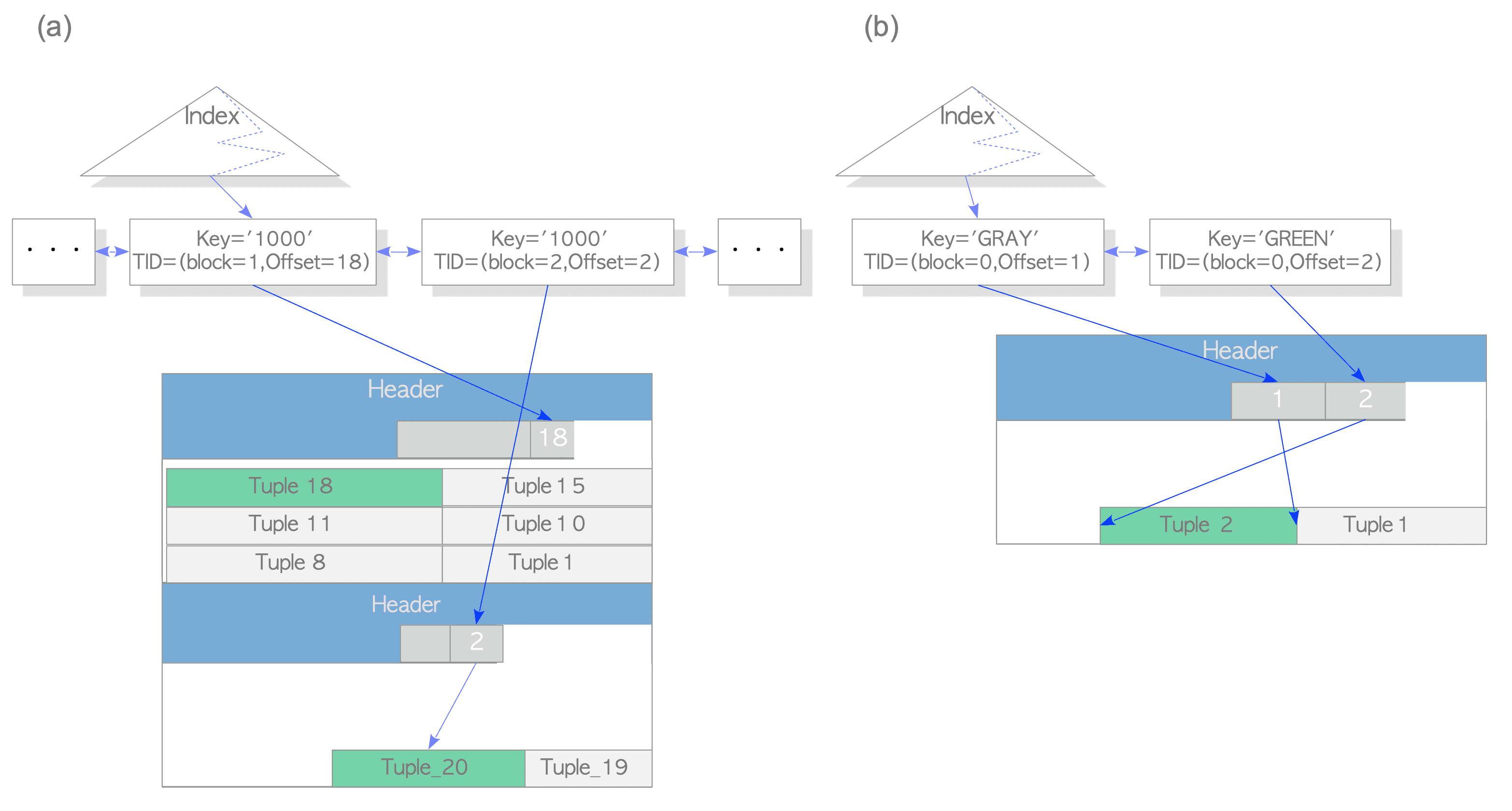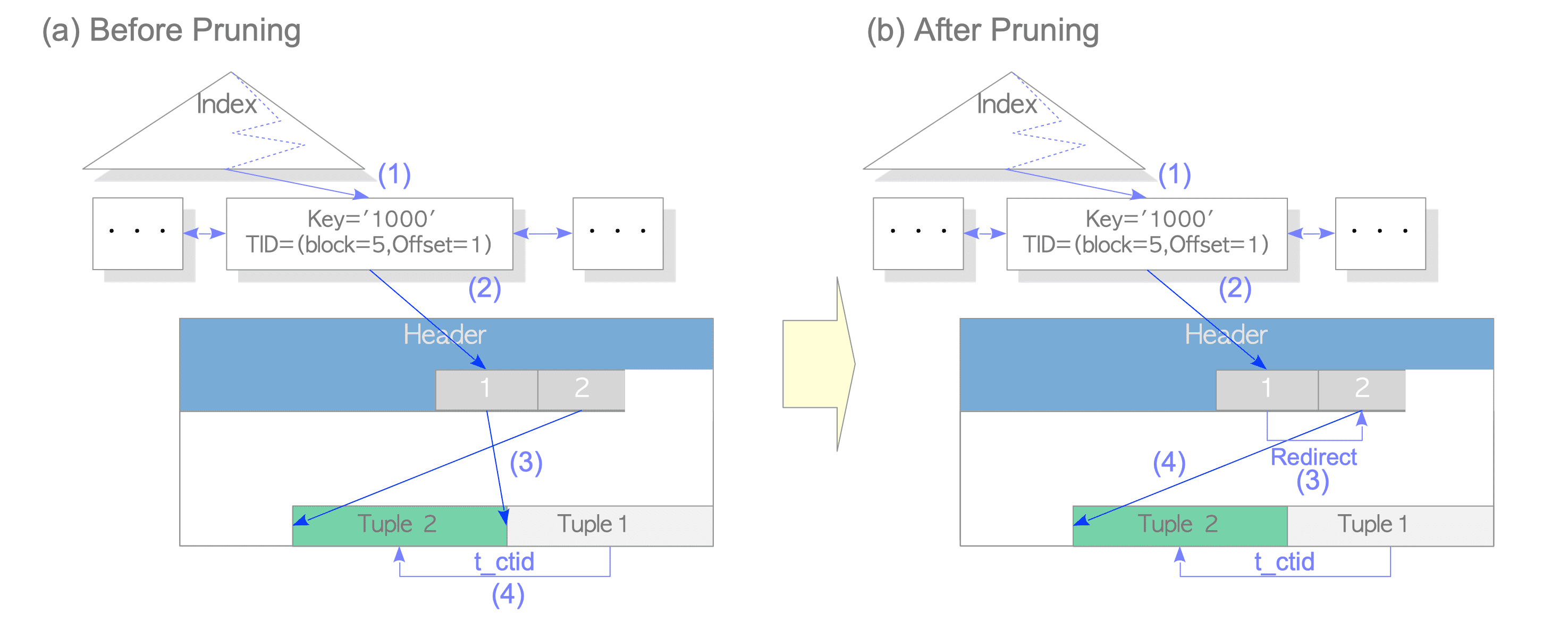 However, a problem arises if the dead tuples in the table pages are removed. For example, in Fig. 7.4(a), if ‘Tuple_1’ is removed since it is a dead tuple, ‘Tuple_2’ cannot be accessed from the index.(然而,也产生了一个问题,如果旧的元组被当做死元组被移除了,例如上面例子中,如果