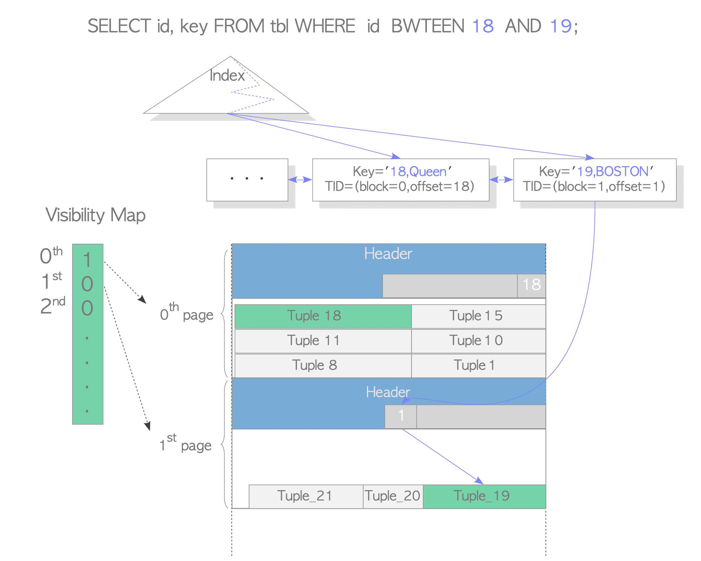- All tuples in the 0th page are always visible; the tuples in the 1st page are not always visible. Note that the visibility of each page is stored in the corresponding visibility map, and the visibility map is described in Section 6.2.(第0页所有元组总是可见的,第1页中的元组并不总是可见的。注意每一个页面的可见性都被存储在相应的VM文件中)
