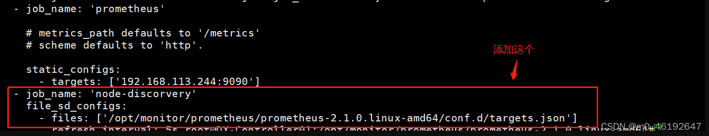路径切换到:/opt/monitor/prometheus/prometheus-2.1.0.linux-amd64# 执行命令:vim prometheus.yml