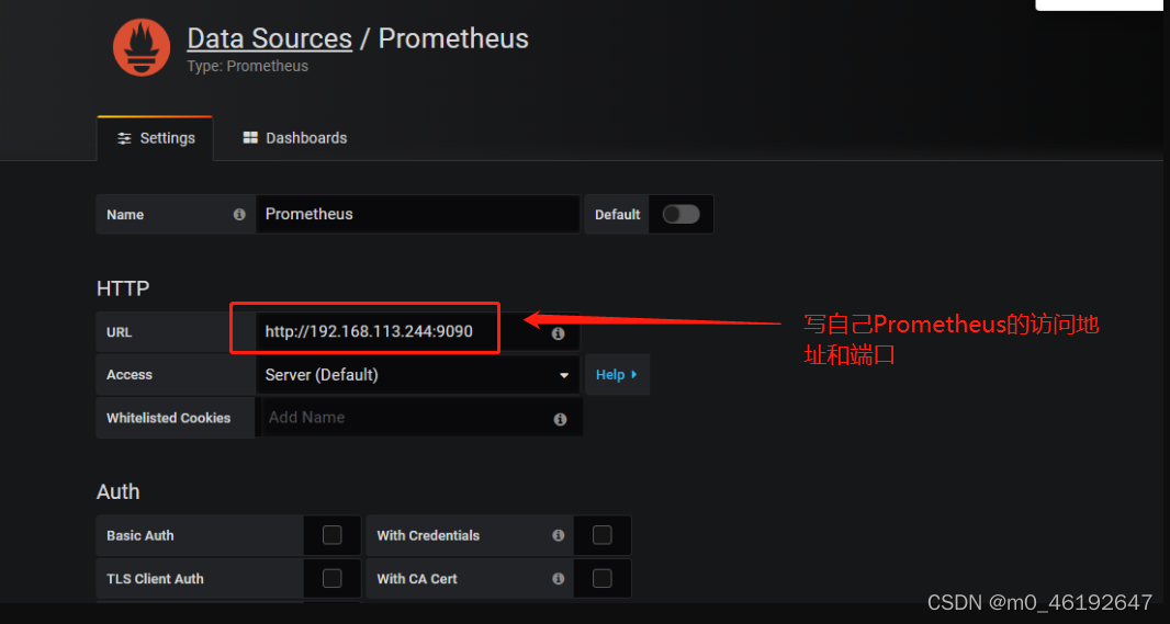 在内输入以下内容(在这里我定义了一个自己的prometheus:192.168.113.244:9090)