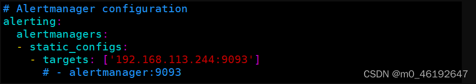 # Alertmanager configuration alerting: alertmanagers: - static_configs: - targets: ['192.168.113.244:9093'] #更改成自己的Alertmanager的 IP+端口号 # - alertmanager:9093