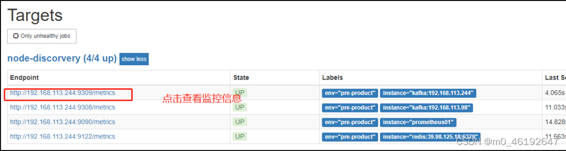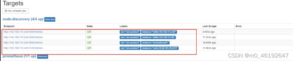 #一个kafka可监控多个kafka(启动命令) nohup ./kafka_exporter --kafka.server=192.168.113.98:9092 --web.listen-address=:9308 & nohup ./kafka_exporter --kafka.server=192.168.113.244:9092 --web.listen-address=:9309 &