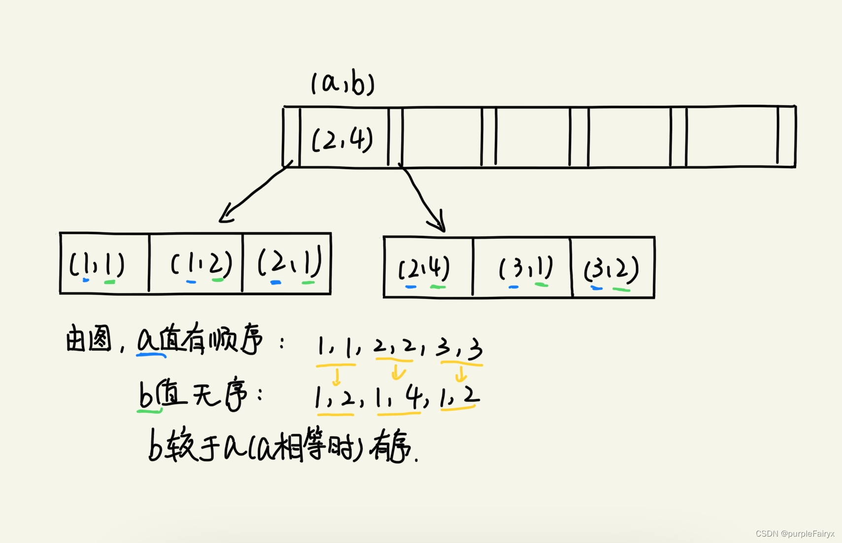 可以看到a的值是有顺序的,1,1,2,2,3,3,而b的值是没有顺序的1,2,1,4,1,2。所以b = 2这种查询条件没有办法利用索引,因为联合索引首先是按a排序的,b是无序的。