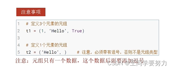 元组定义:定义元组使用小括号,且使用逗号隔开各个数据,数据可以是不同的数据类型。