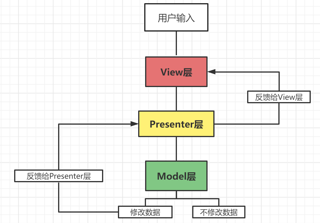 在 MVC 框架中,View 层可以通过访问 Model 层来更新,但在 MVP 框架中,View 层不能再直接访问 Model 层,必须通过 Presenter 层提供的接口,然后 Presenter 层再去访问 Model 层。