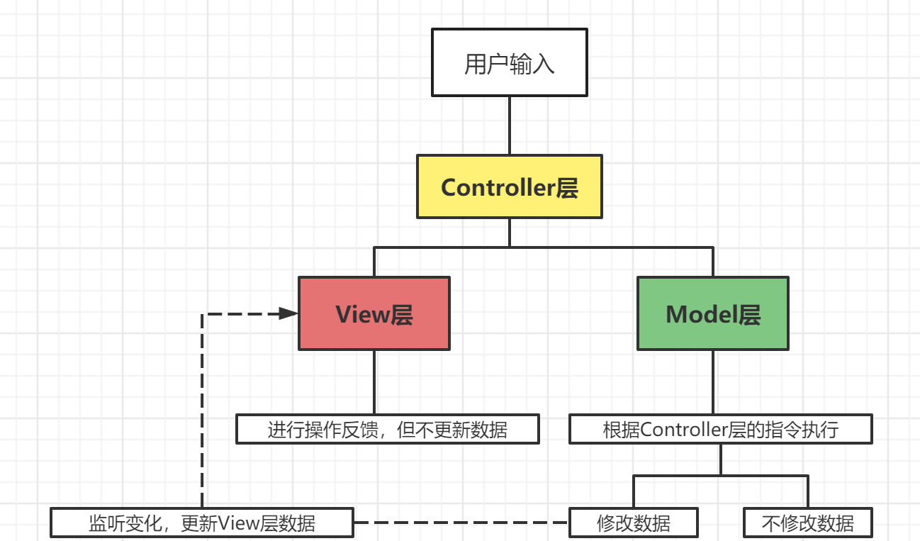 注意:Controller 层触发 View 层时,并不会更新 View 层中的数据,View 层中的数据是通过监听 Model 层数据变化而自动更新的,与 Controller 层无关。