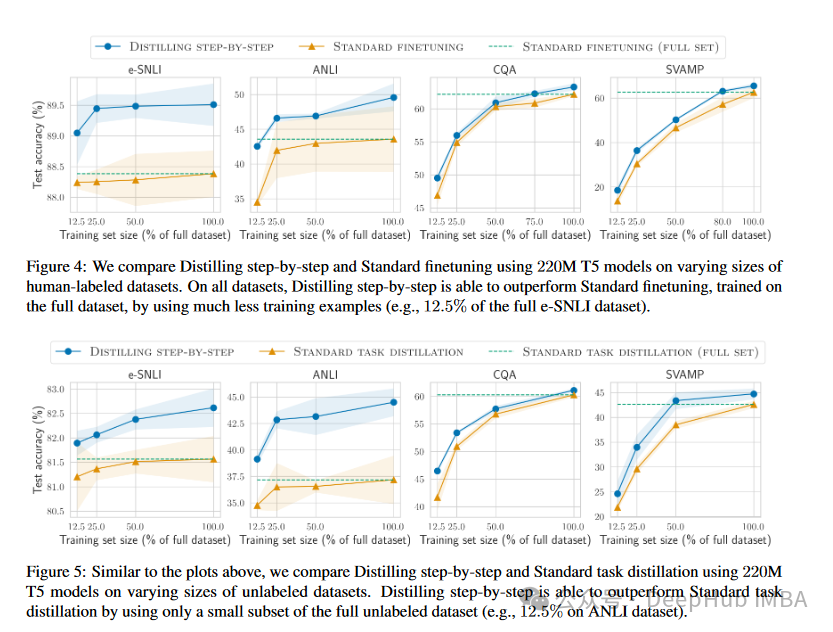 论文中的图 4 和图 5 以可视化方式展示了这种数据效率优势。 在这些实验中,研究人员将 “Distilling Step-by-Step” 与两种常见方法进行了比较:标准微调 (Fine-tuning)(当有人工标记的数据可用时)和 标准任务知识蒸馏(当只有未标记的数据可用时)。 他们使用不同数量的训练数据为每种方法训练了 220M T5-Base 模型,并评估了它们在几个 NLP 基准数据集上的性能。