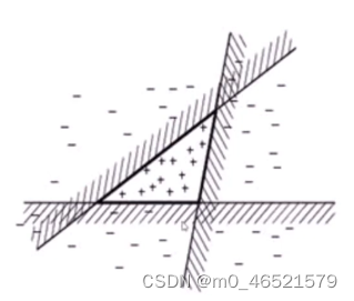 上述数据集中,每个线性模型都不能成功将该数据集分类,3个线性模型的简单综合可将该数据集成功分类。