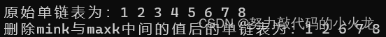 printf("删除mink与maxk中间的值后的单链表为:"); // 输出提示信息