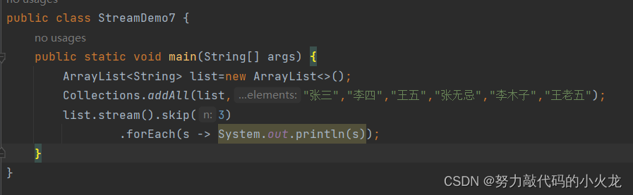Stream<T> skip(long n) 跳过前几个元素