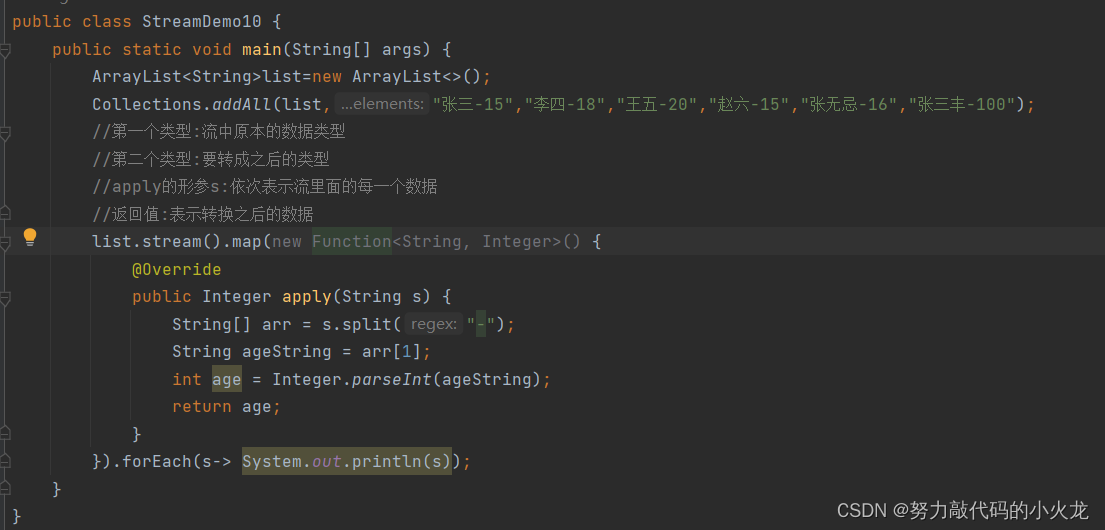 第一个类型:流中原本的数据类型 第二个类型:要转成之后的类型 apply的形参s:依次表示流里面的每一个数据 返回值:表示转换之后的数据