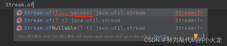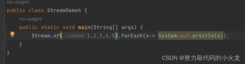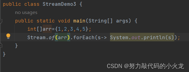 Stream接口中静态方法of的细节:方法的形参是一个可变参数,可以传递一堆零散的数据,也可以传递数组但是数组必须是引用数据类型的,如果传递基本数据类型,是会把整个数组当做一个元素,放到stream当中。