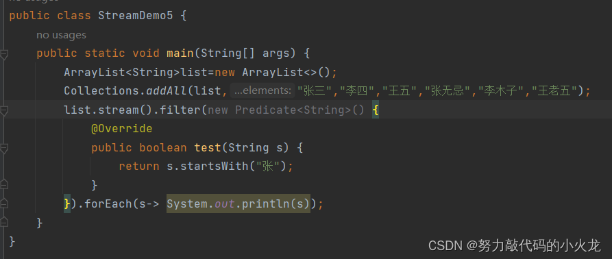 Stream<T>filter(Predicate<? super T> predicate) 过滤