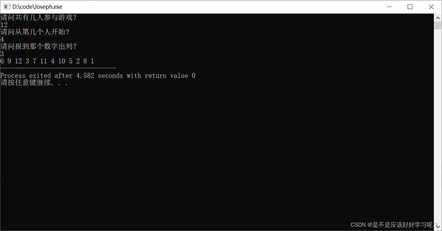 (4)、删除该结点,同时以该结点的后继结点指针记为p,重复步骤(2),直到循环链表为空。