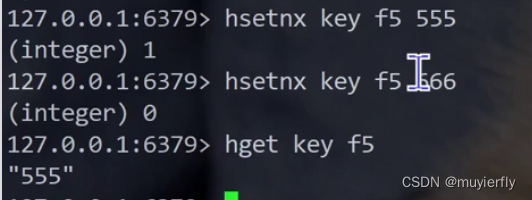 redis> HSETNX myhash field "Hello"(integer) 1redis> HSETNX myhash field "World"(integer) 0redis> HGET myhash field"Hello"