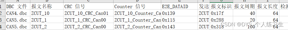 第一步读取.dbc文件,获取带E2E校验的报文,生成excel表格,目标生成结果如下