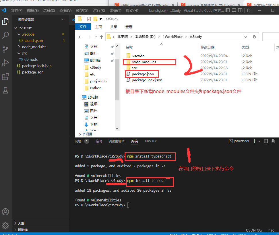 其次,切换到项目的根目录下,在终端窗口输入以下命令:“npm install typescript”、“npm install ts-node”。此时,会在项目的根目录下创建一个名为node_modules的文件夹和package.json的文件,如下所示: