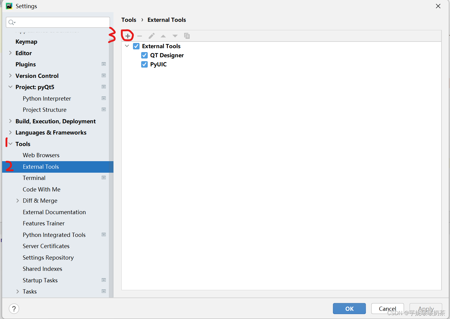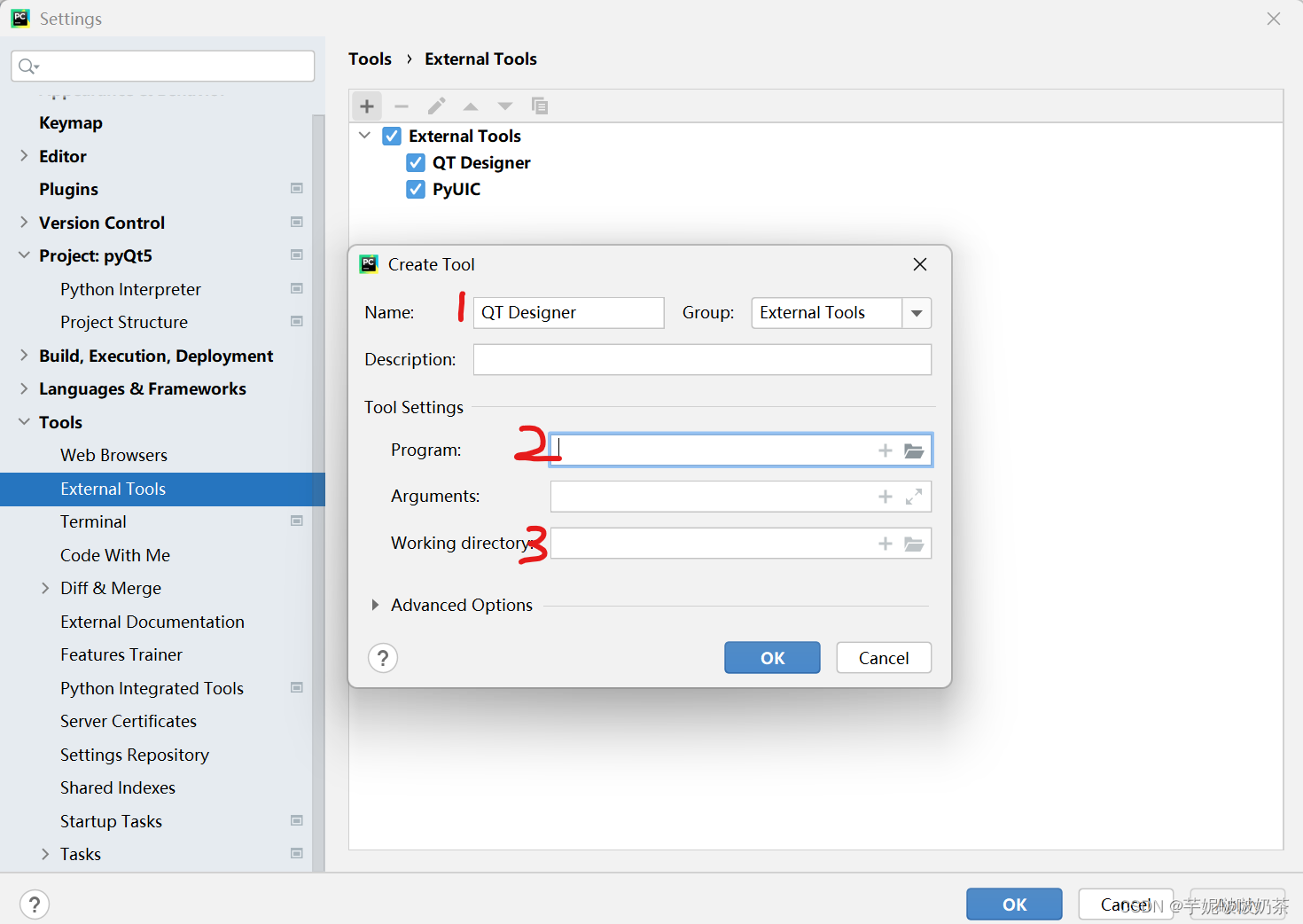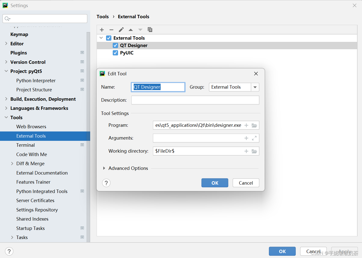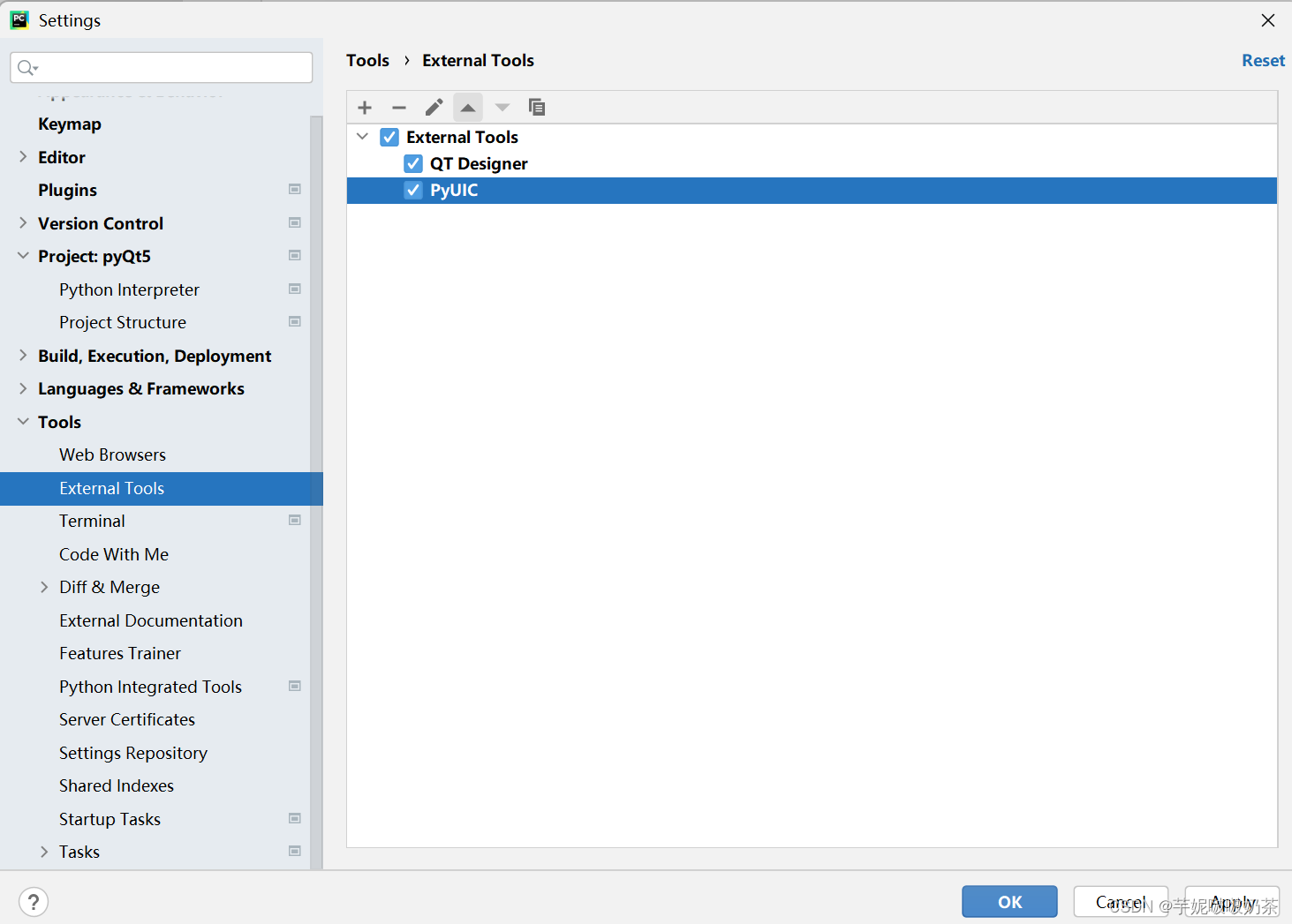 file——>Setting——>Tools——>External Tools——>"+"结果如下。