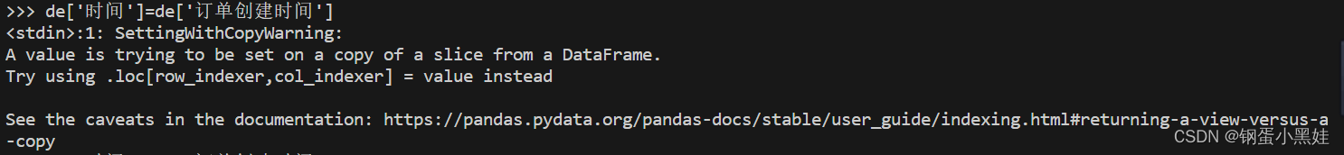 关于dataframe中的警告A value is trying to be set on a copy of a slice from a DataFrame问题解决 这个警告意思是pandas在使用de[‘列名’]赋值时会返回一个试图而不是原始的dataframe,这种情况下对视图进行修改可能无法生效。按照上述两种方法操作后发现方法①执行后还是给出警告,方法②则是不会发出警告,因此利用copy()方法是有效的。在pandas处理dataframe时新增一列数据时发现这里给出警告,但不影响程序的正常运行。
