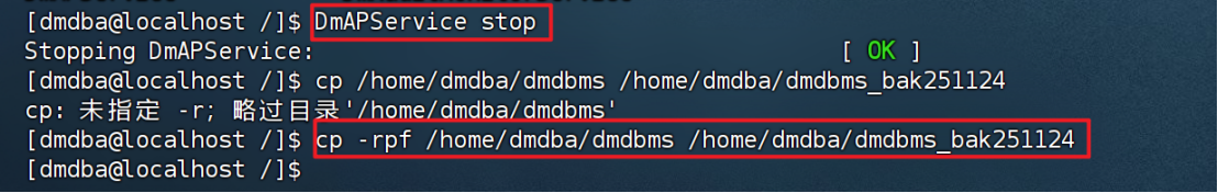 cp -rpf /home/dmdba/dmdbms /home/dmdba/dmdbms_bak251124