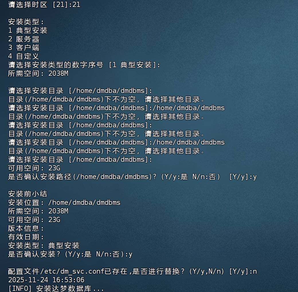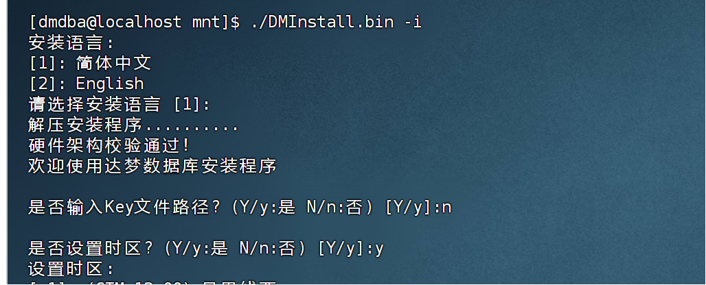 (2) 安装到原软件目录:/home/dmdba/dmdbms/ (将原软件目录下的文件进行备份后删除,否则不能按照到该目录下)