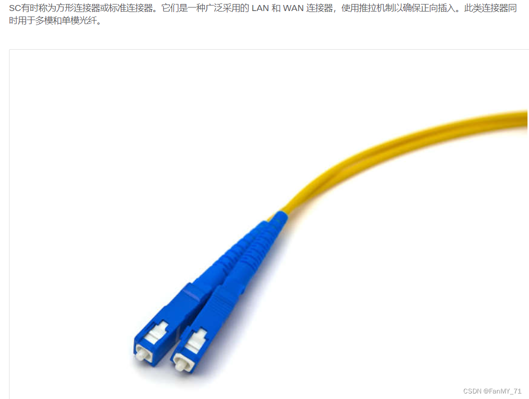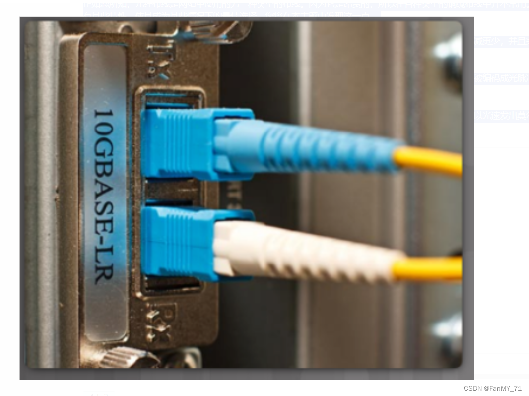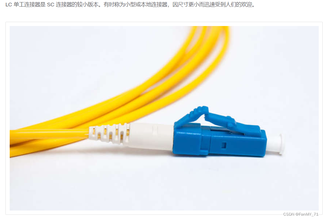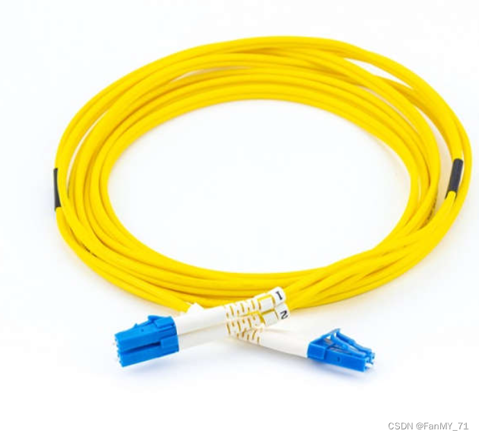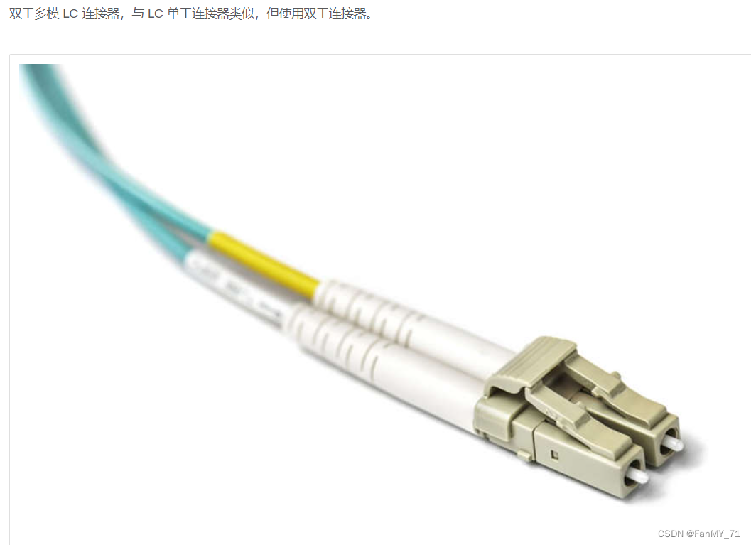 直到最近,光还只能在光纤上沿一个方向传播。因此,需要两根光纤来支持全双工操作。因此,光纤跳线是将两根光纤线缆捆绑在一起,并通过一对标准的单光纤接头端接。有些光纤连接器可以在单个连接器上同时传送和接收光纤,称为双工连接器,如图中的双工多模 LC 连接器所示。诸如100BASE-BX之类的BX标准使用不同的波长在单个光纤上发送和接收数据。