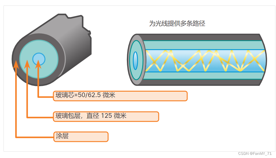 - 多模光纤 (MMF):多模光纤包含一个稍大的芯,使用 LED 发射器发送光脉冲。具体而言,LED 发出的光从不同角度进入多模光纤,如图所示。普遍用于 LAN 中,因为它们可以由低成本的 LED 提供支持。它可以通过长达 550 米的链路提供高达 10 Gb/s 的带宽。
