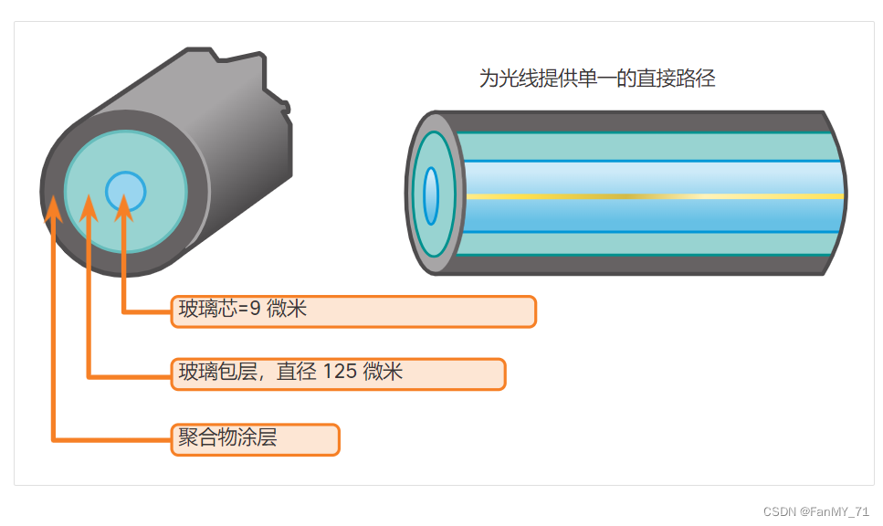 - 单模光纤 (SMF):单模光纤包含一个极小的芯,使用昂贵的激光技术来发送单束光,如图所示。单模光纤在跨越数百公里的长距离传输情况下很受欢迎,例如应用于长途电话和有线电视中的光纤。