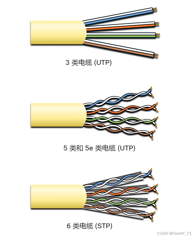 -3 类电缆最初用于语音线路的语音通信,但后来用于数据传输。 -5 类和5e 类电缆用于数据传输。5类电缆支持 100Mbps,5e 类电缆支持 1000 Mbps -6类电缆在每对线之间增加了一个分隔器以支持更高的速度。 6类电缆支持高达 10 Gbps。 -7类电缆也支持 10 Gbps。 -8类电缆支持 40 Gbps。
