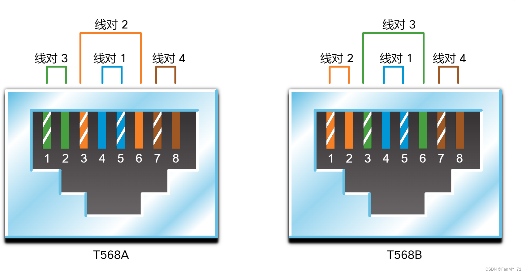 | 以太网交叉线 | 一端为 T568A,另一端为 T568B | 连接两个网络主机或连接两台网络中间设备 (交换机到交换机或路由器到路由器) |